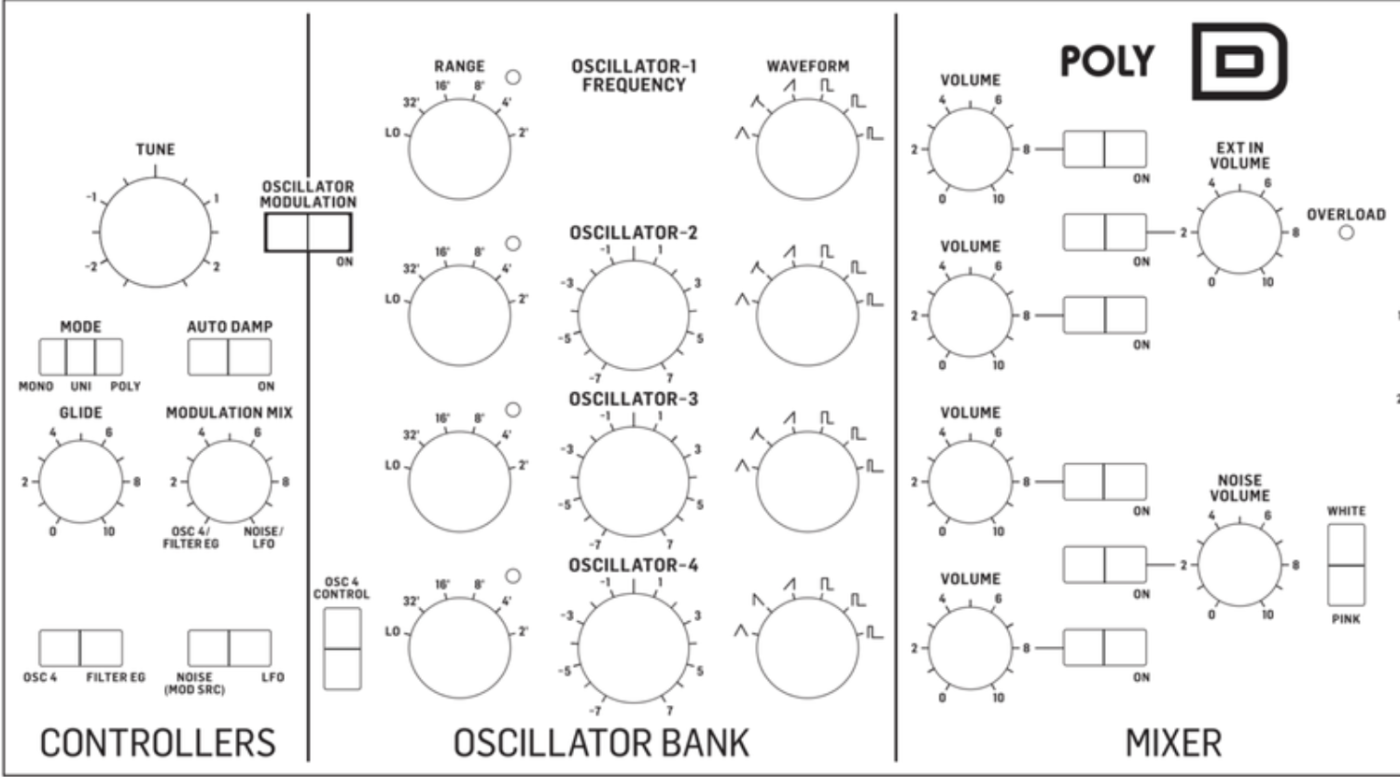 The Poly D is heavily inspired by the iconic Moog Minimoog, one of the first synthesizers to make electronic music widely accessible.
